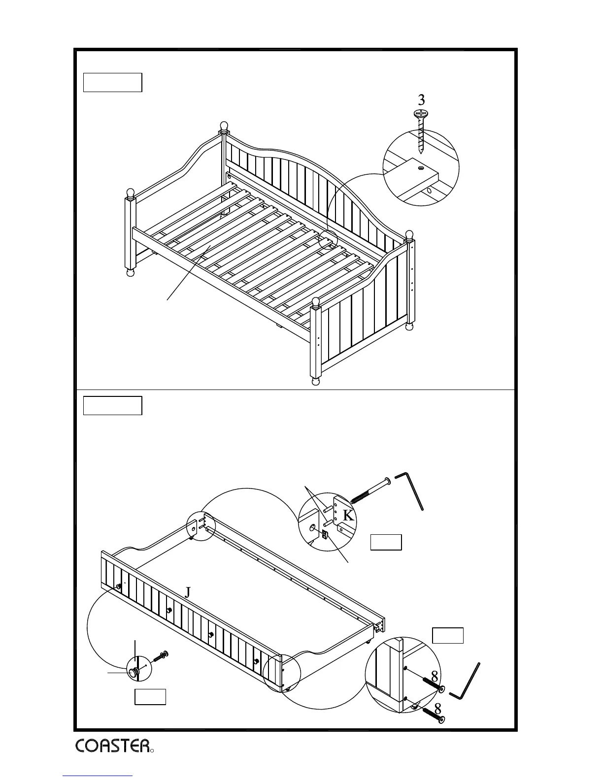Align and fasten roll slat(E) to bed rails using wood screw(3).