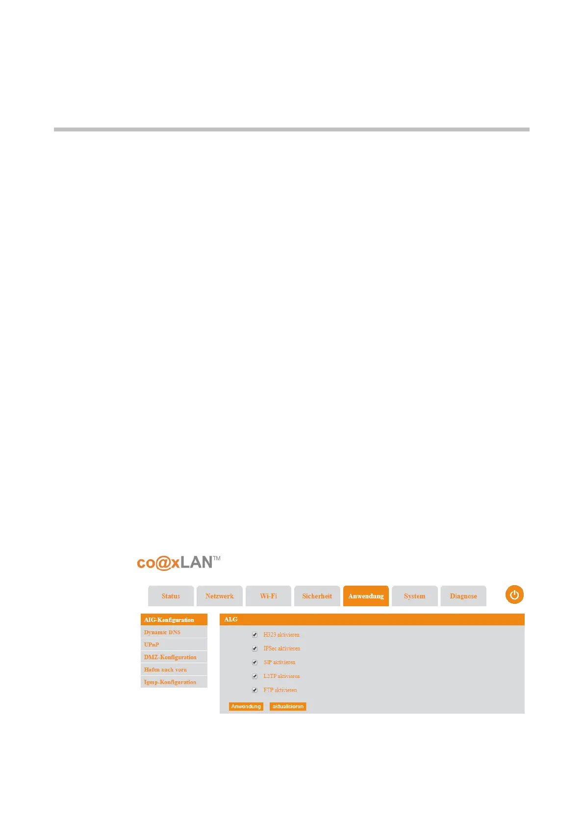 If the ALG Setting sub-menu is selected the screen shown in Picture is displayed. This page