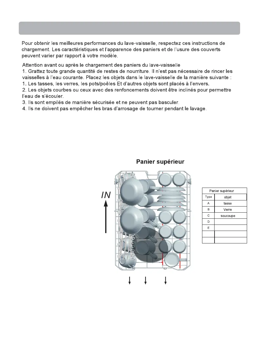 plus d'espace pour de grands ustensiles dans le panier supérieur ou le
