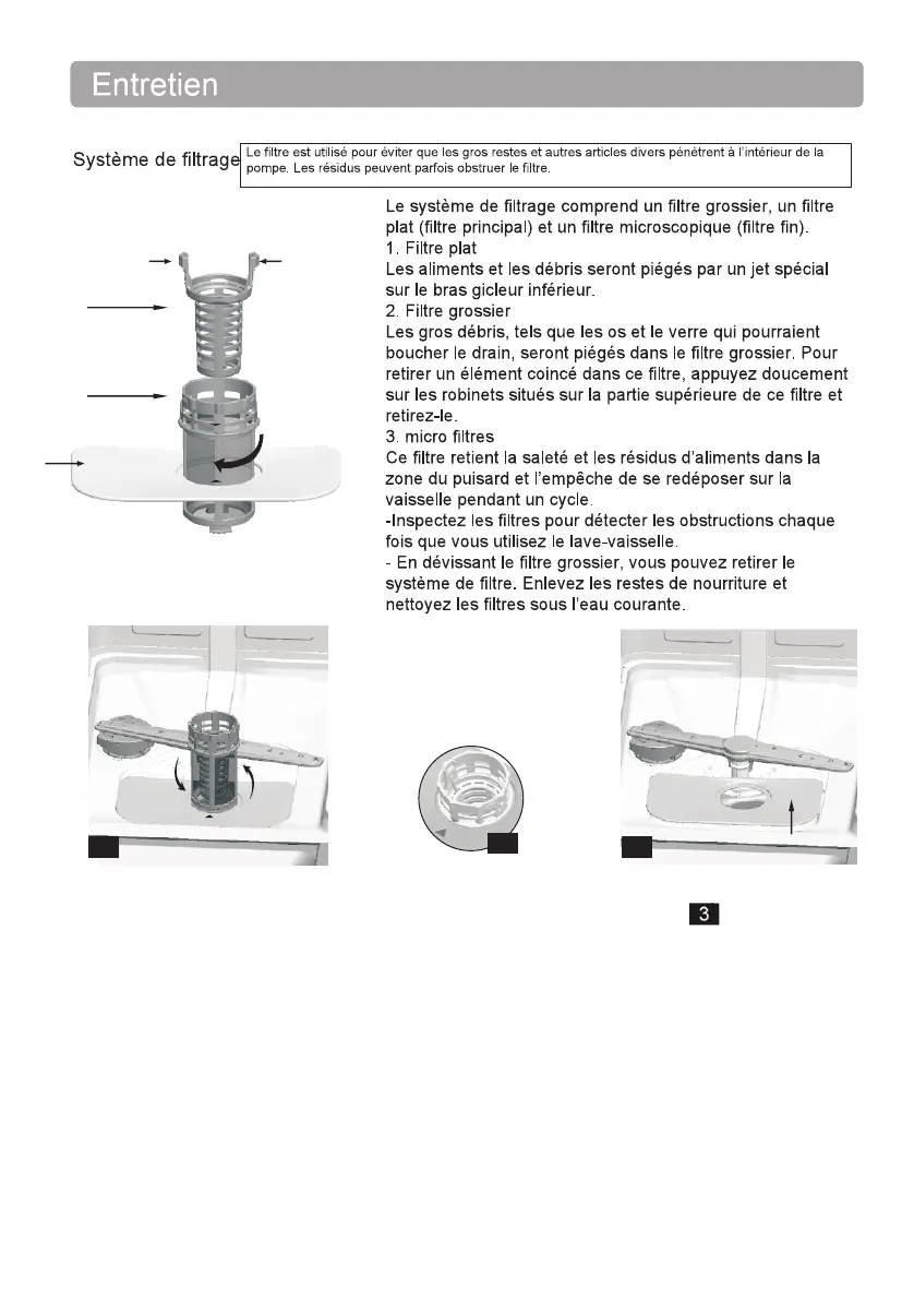 et en appuyant vers le bas. Le lave-vaisselle ne doit jamais être utilisé sans les filtres. Le