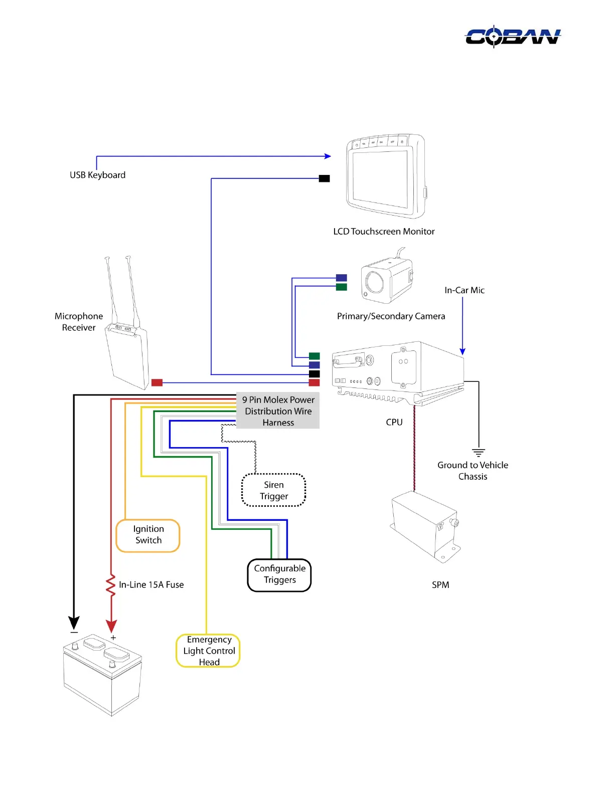 Connect the COBAN cables and the 9-Pin Molex wires to the appropriate components and triggers as shown