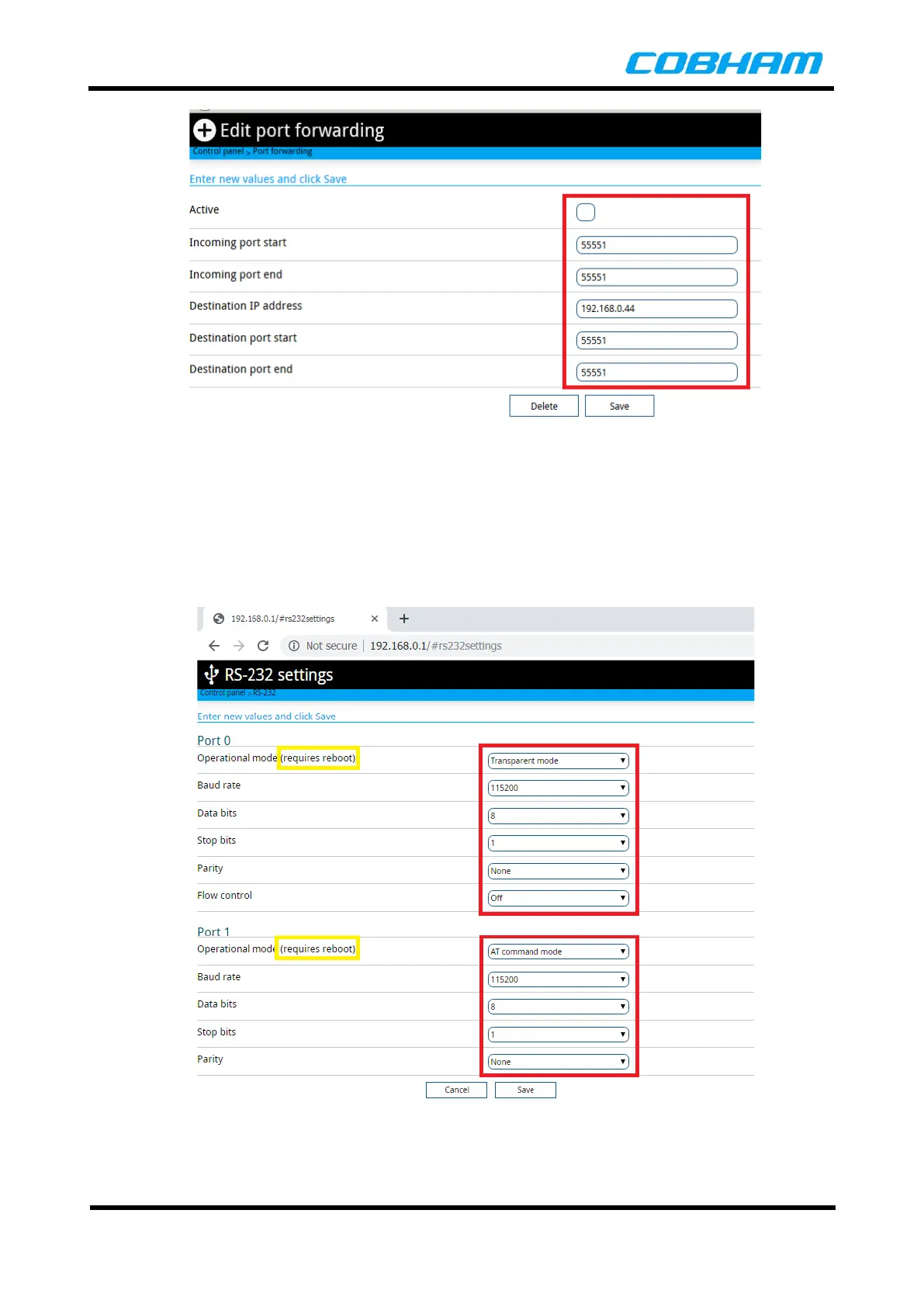 RS-232 serial ports provided on the AVIATOR UAV 200 terminal. One of the RS-232 port can be set