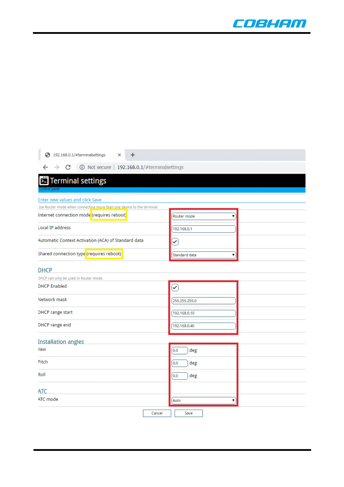 This page also allows the operator to configure the DHCP server settings, install angles of terminal