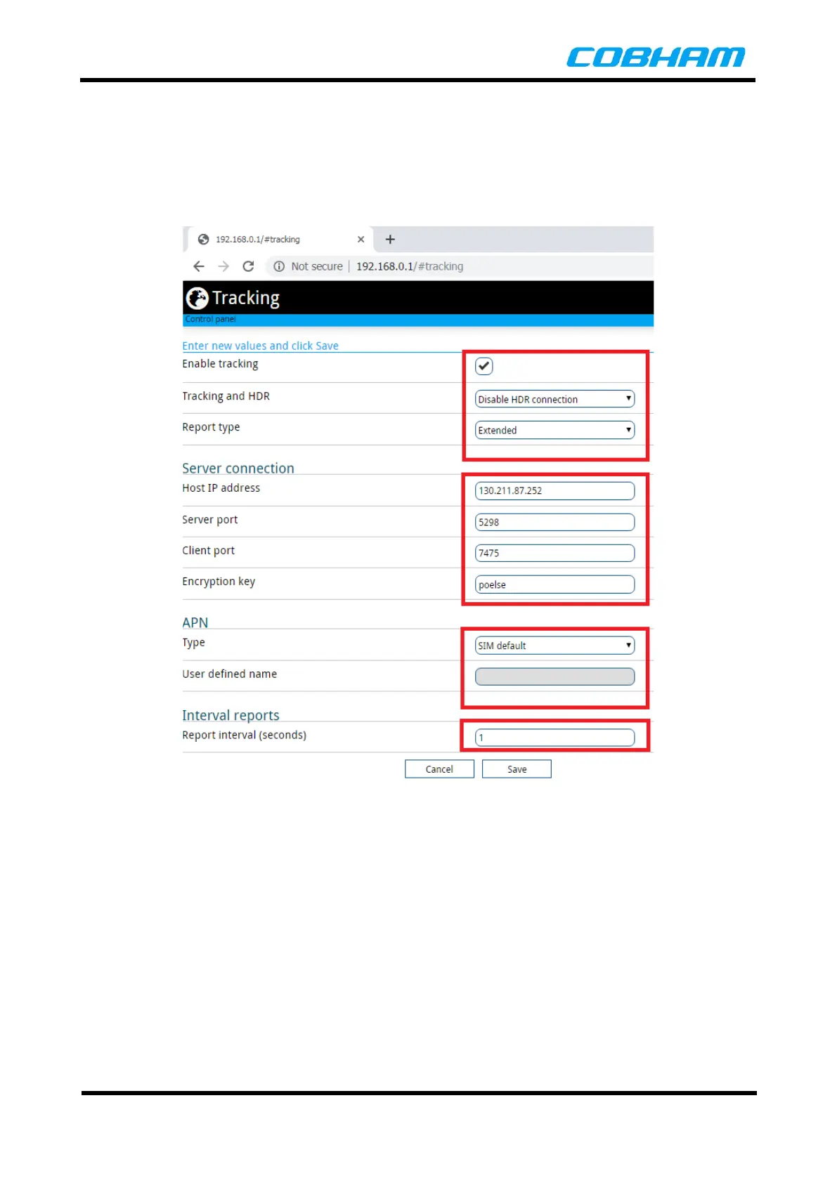 Control Panel Tracking page. The APN and report intervals can be set from this page.