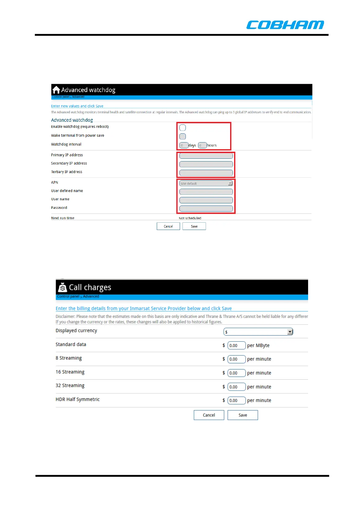 The Call Charges page allows the operator to configure the estimated call costs for the operation for the