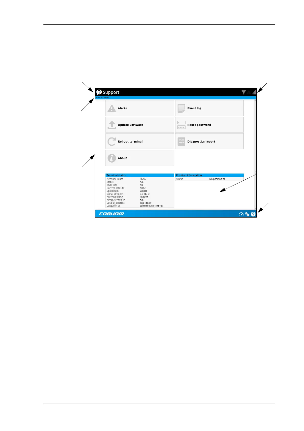 • Status section shows the status of the terminal and the network connection (BGAN),