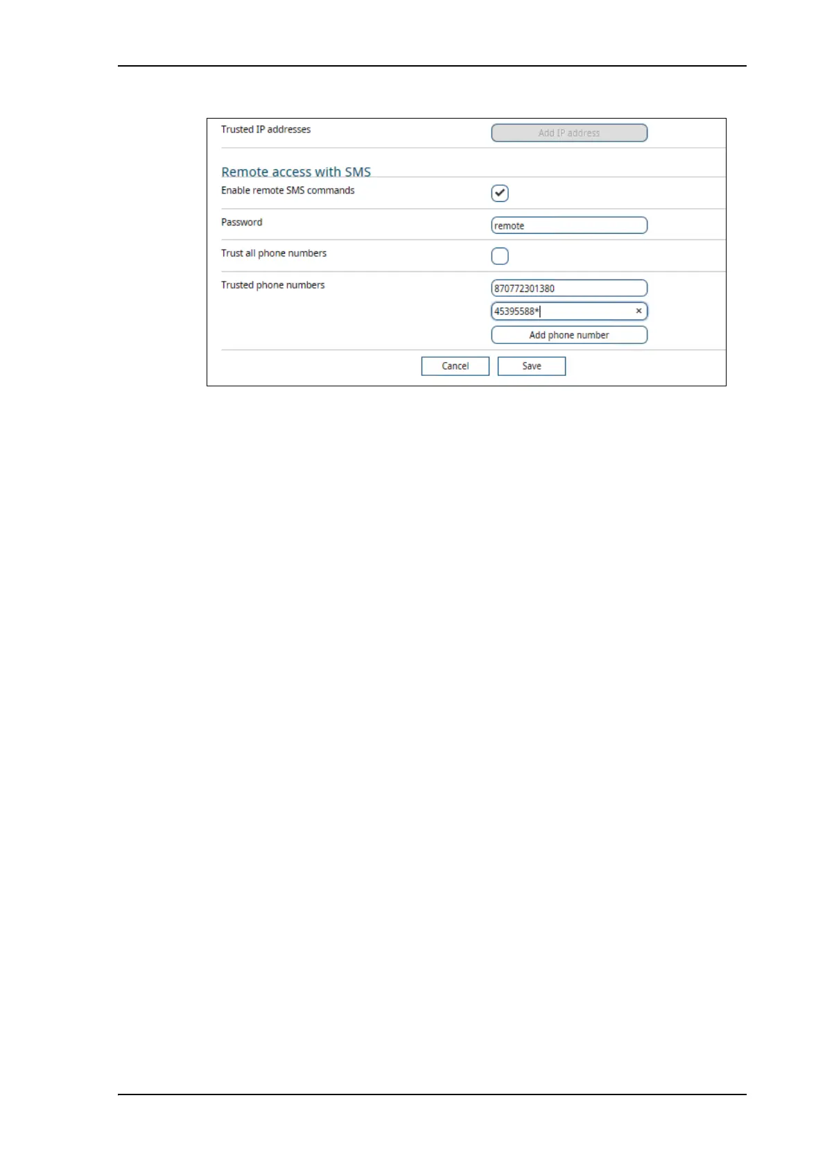 For information on how to send SMS commands, see Remote access with SMS on page 37.
