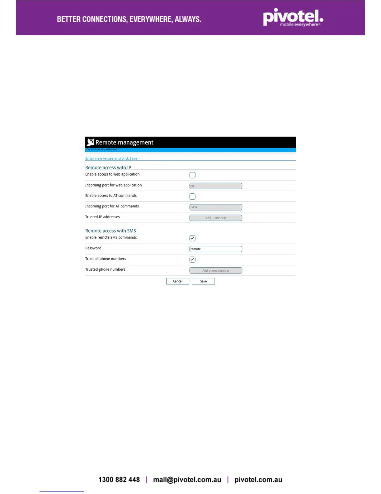 ‘Save’. Please note that this is a terminal level settings and Pivotel will not have a record of the changes. The