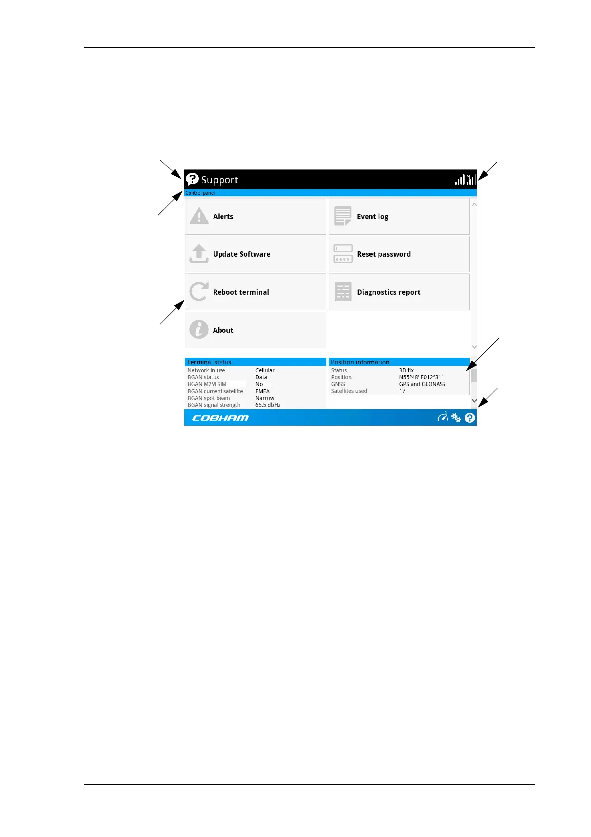• Status section shows the status of the terminal and the network connection (BGAN and