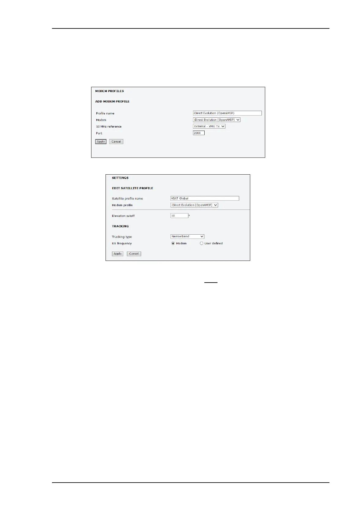 Examples of modem profile and satellite configuration from the ACU web interface are