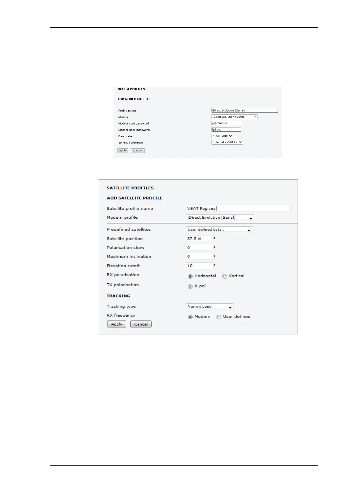 Examples of modem profile and satellite configuration from the ACU web interface are