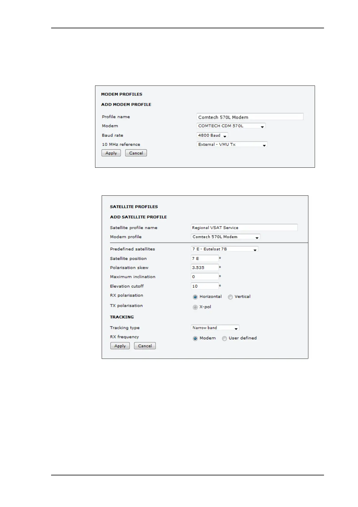 Examples of the modem profile and satellite configuration from the ACU web interface are
