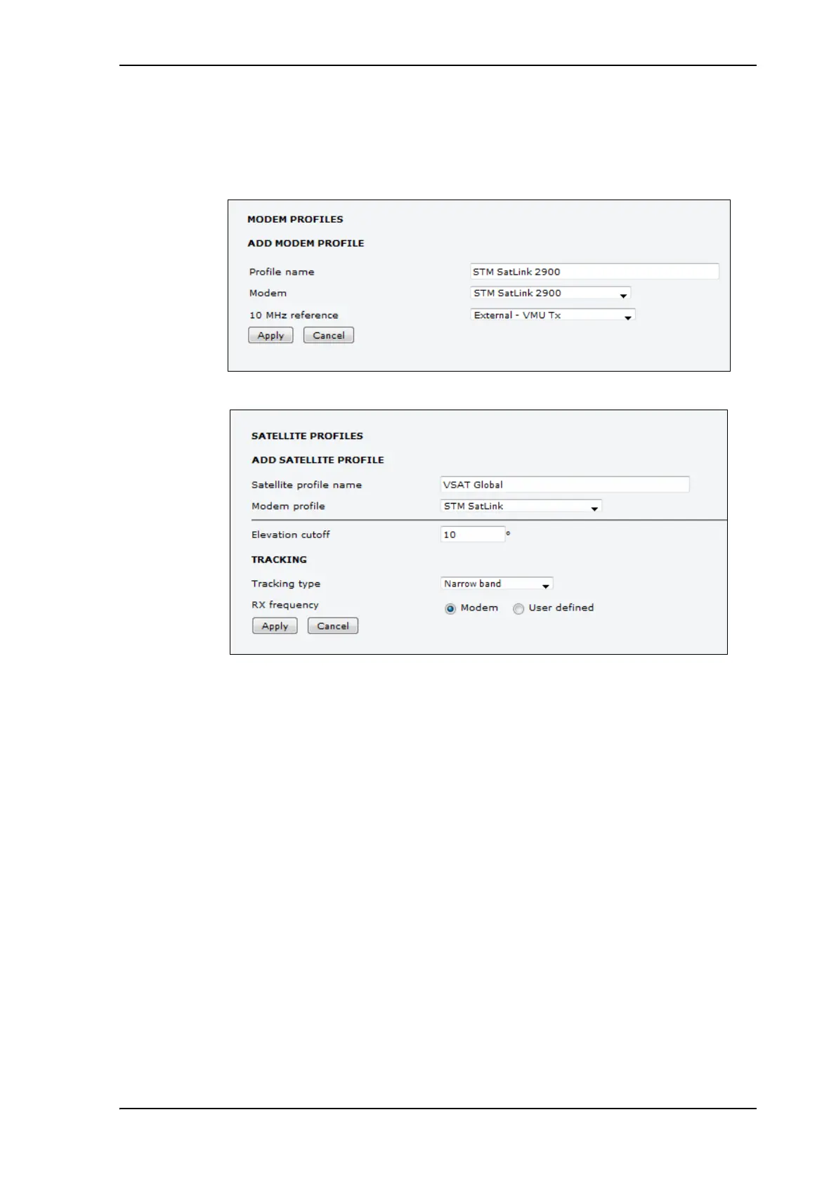 Examples of modem profile and satellite configuration from the ACU web interface are