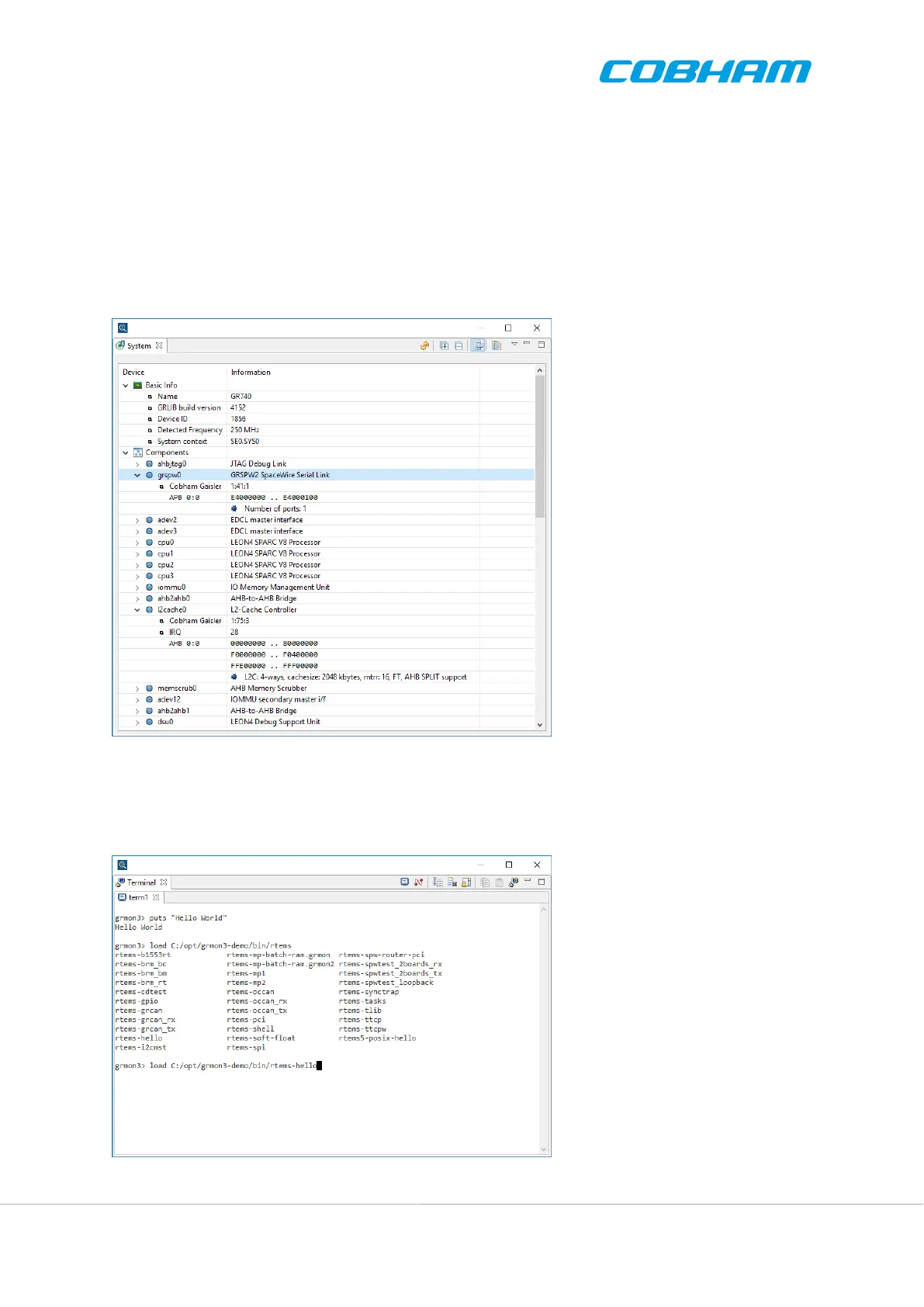 Terminals can be opened to interact with GRMON or to display the output from an application on the target system.