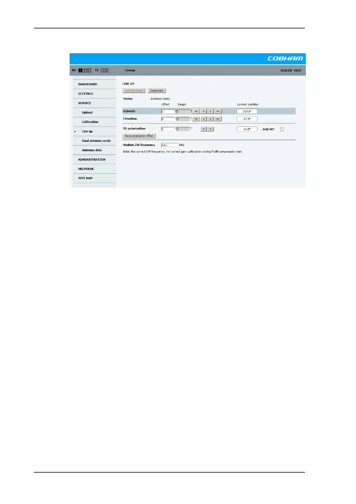 Figure 6-12: Web interface: SERVICE, Line up: Antenna ready