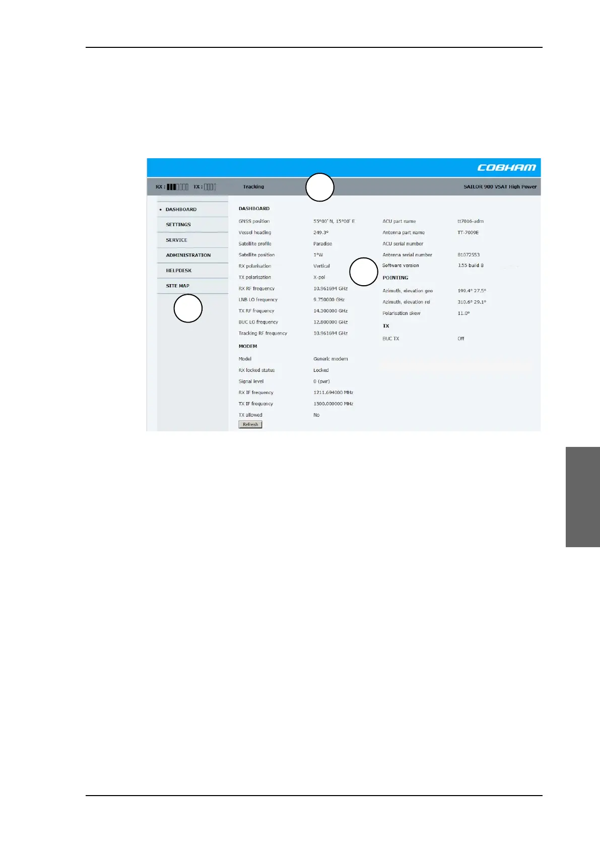 to the satellite. The signal strength of the VSAT modem (if available) is shown on the
