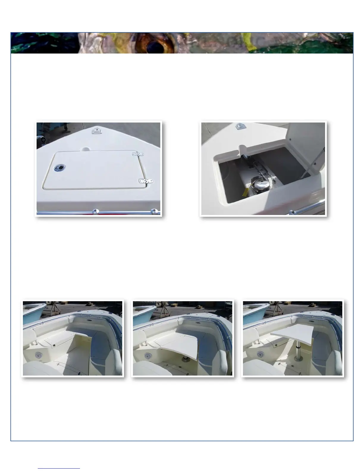 The anchor locker is located at the bow of the boat and is accessible through the anchor locker door or hatch (photo