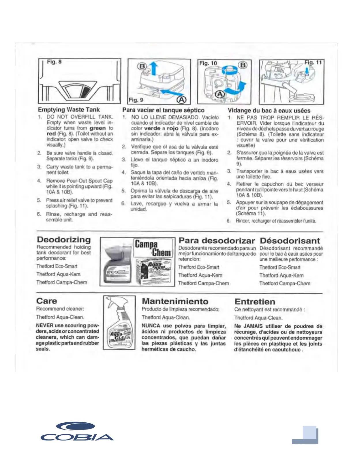 COBIA 240 CC - Portable Toilet Waste Management; Emptying and Cleaning Waste Tank; Deodorizing and Cleaning Agents