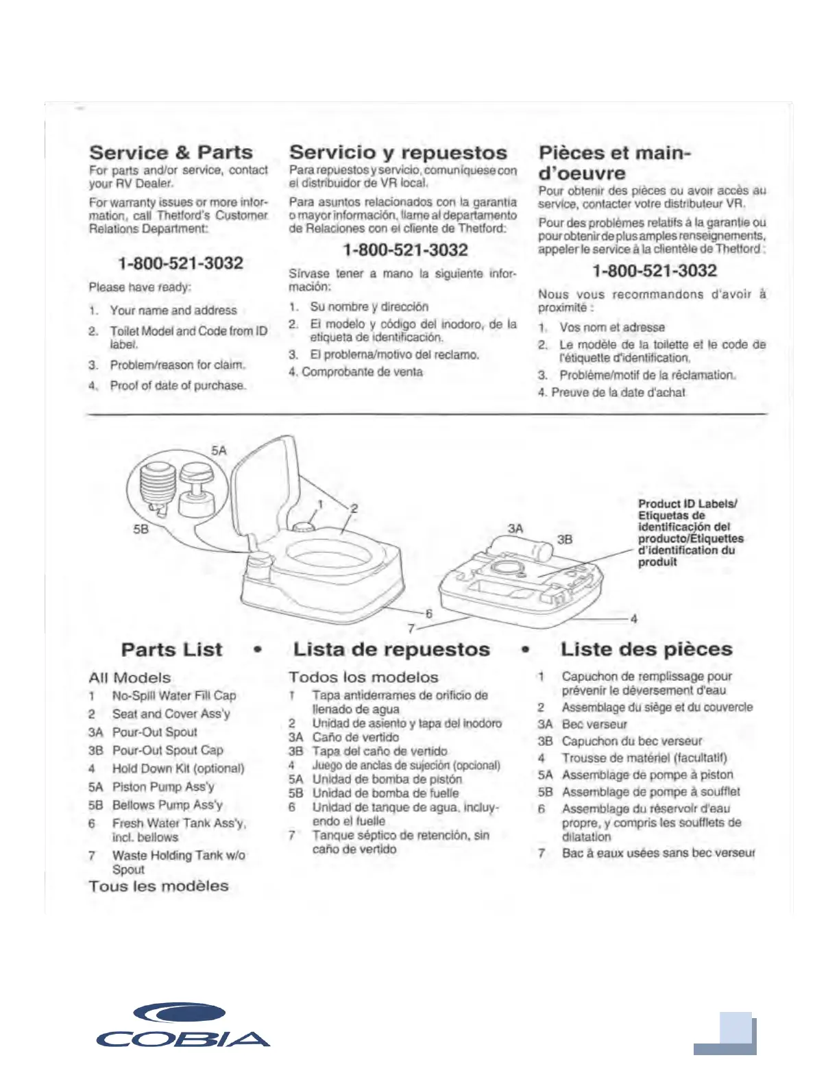 COBIA 240 CC - Service and Parts; Contacting for Support; Portable Toilet Parts List