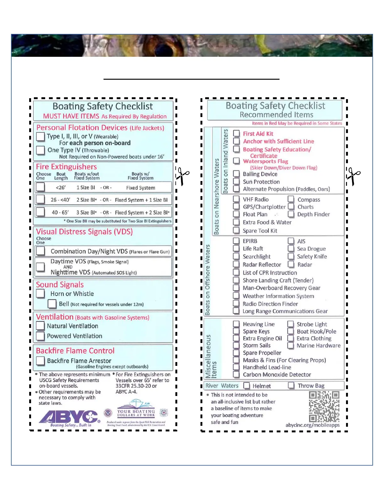 COBIA 280 DC 2019 - Pre-Operation Checklist; Boating Safety Checklist (Required); Boating Safety Checklist (Recommended); Visual Distress Signals (VDS)