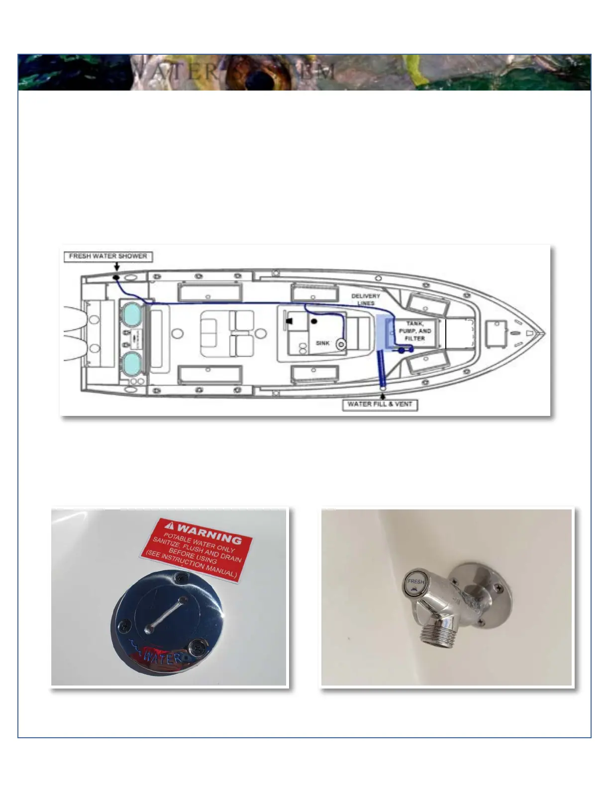 The fresh water tank on your 301 CC can be filled at the cap labeled “WATER” on the starboard deck gunnel. To pressurize
