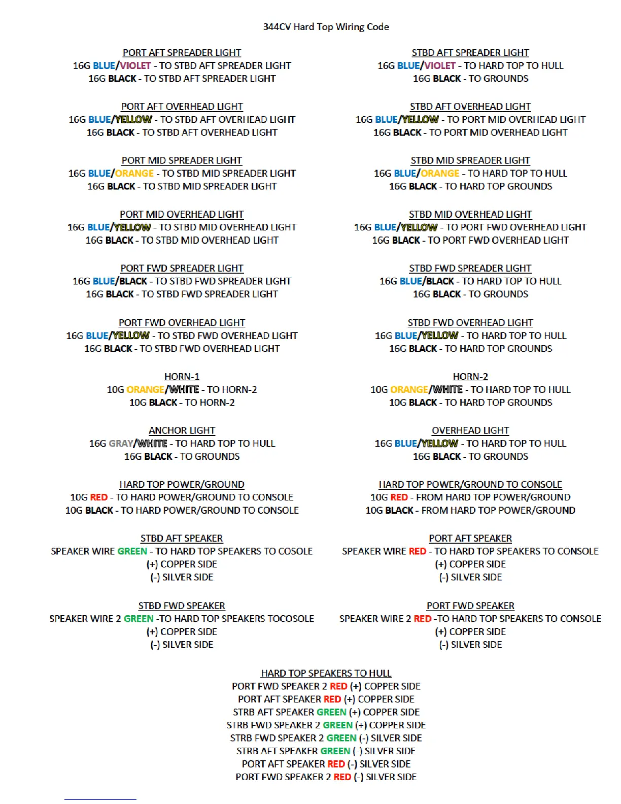 COBIA 344 CC - Hard Top Wiring Codes; Hard Top Component Wiring