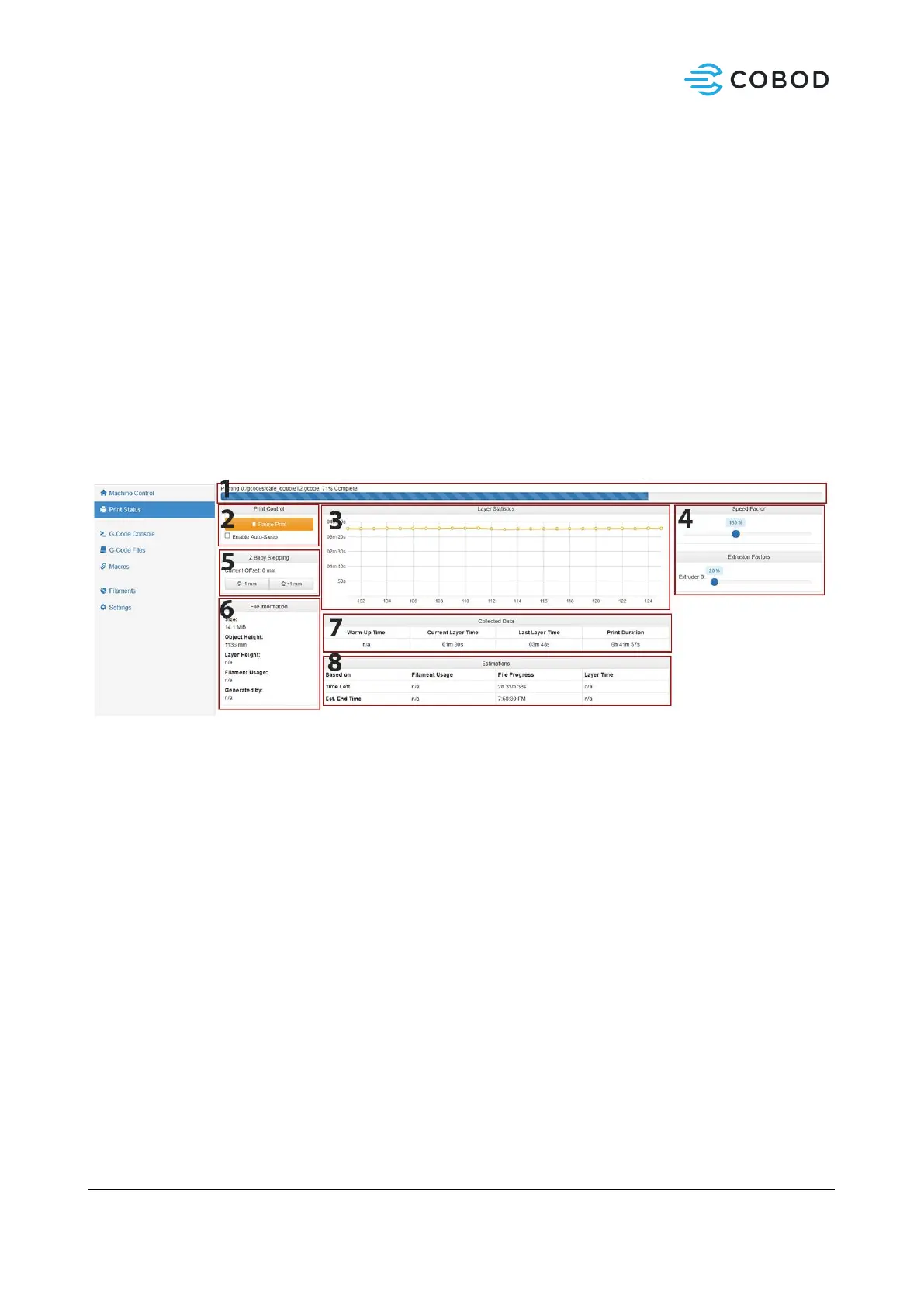 1. Status bar indicating current print-job file as well as percentage of completion.