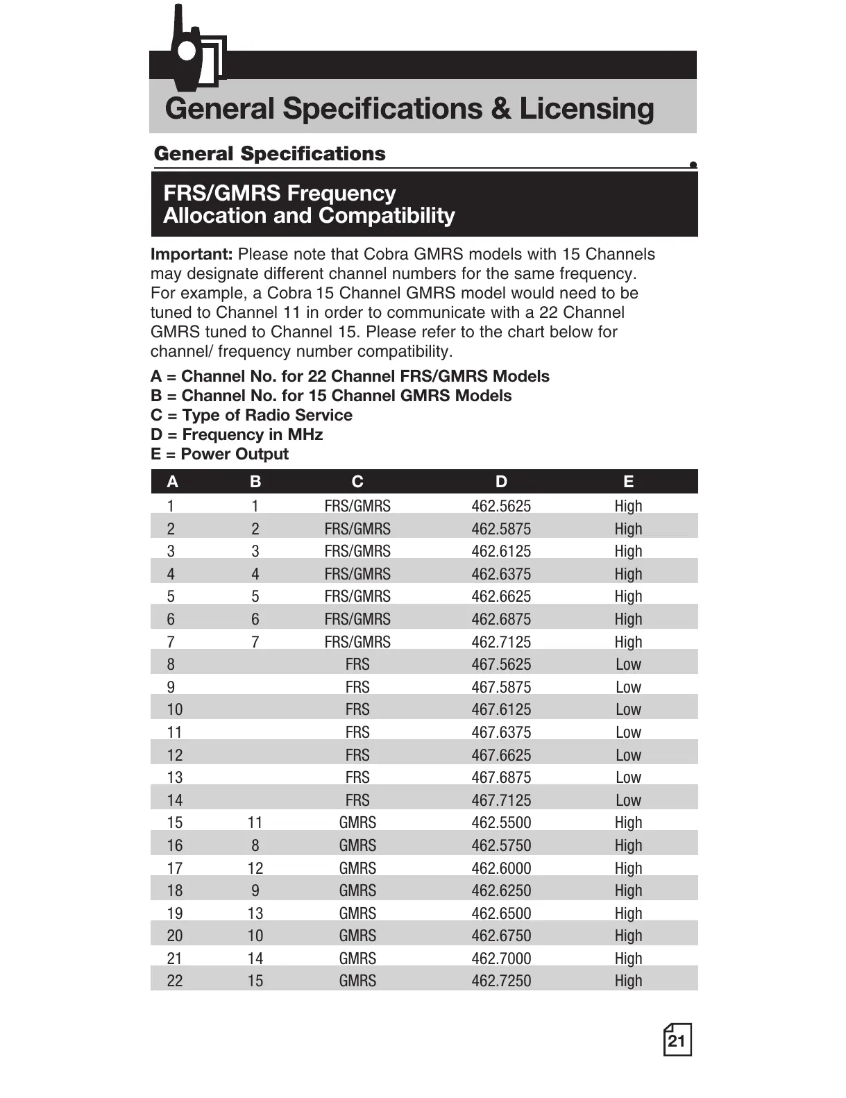 A = Channel No. for 22 Channel FRS/GMRS Models