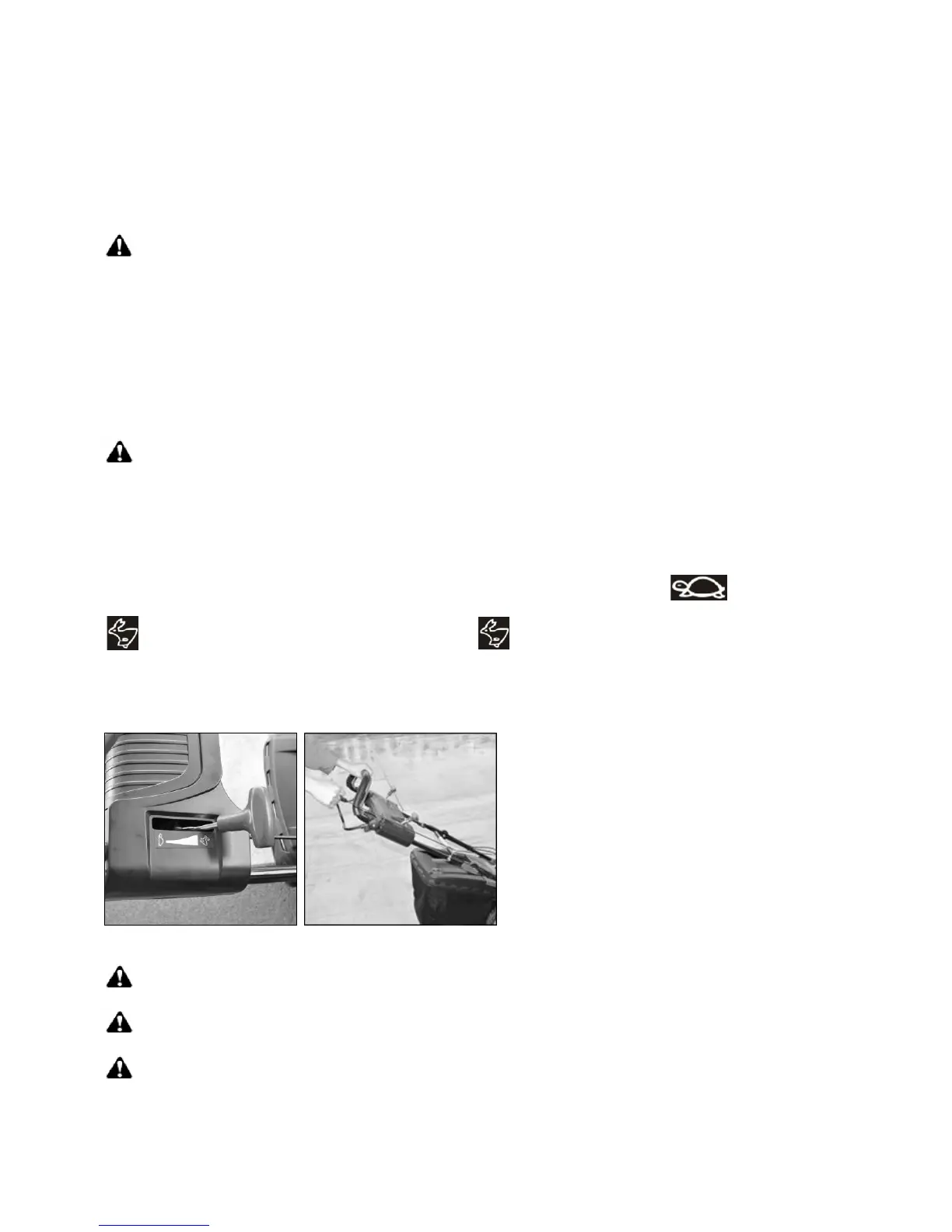 Start the engine carefully according to instructions and with feet well away from the blade.