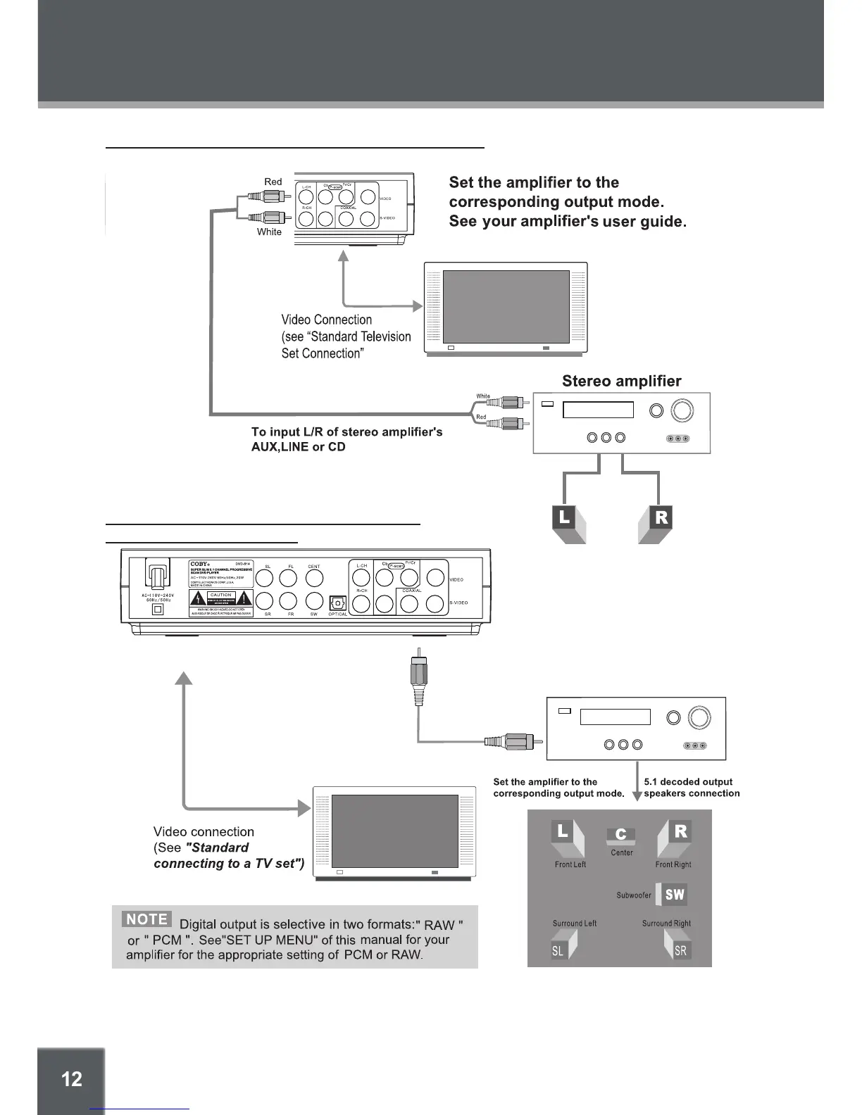 Coby DVD-514 - Connections; Stereo Audio Connection to Amplifier; 5.1 Channel Digital Audio Connection