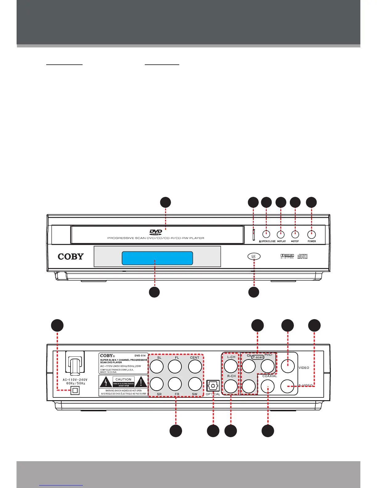 Coby DVD-755 - Location of Controls; Front Panel; Rear Panel