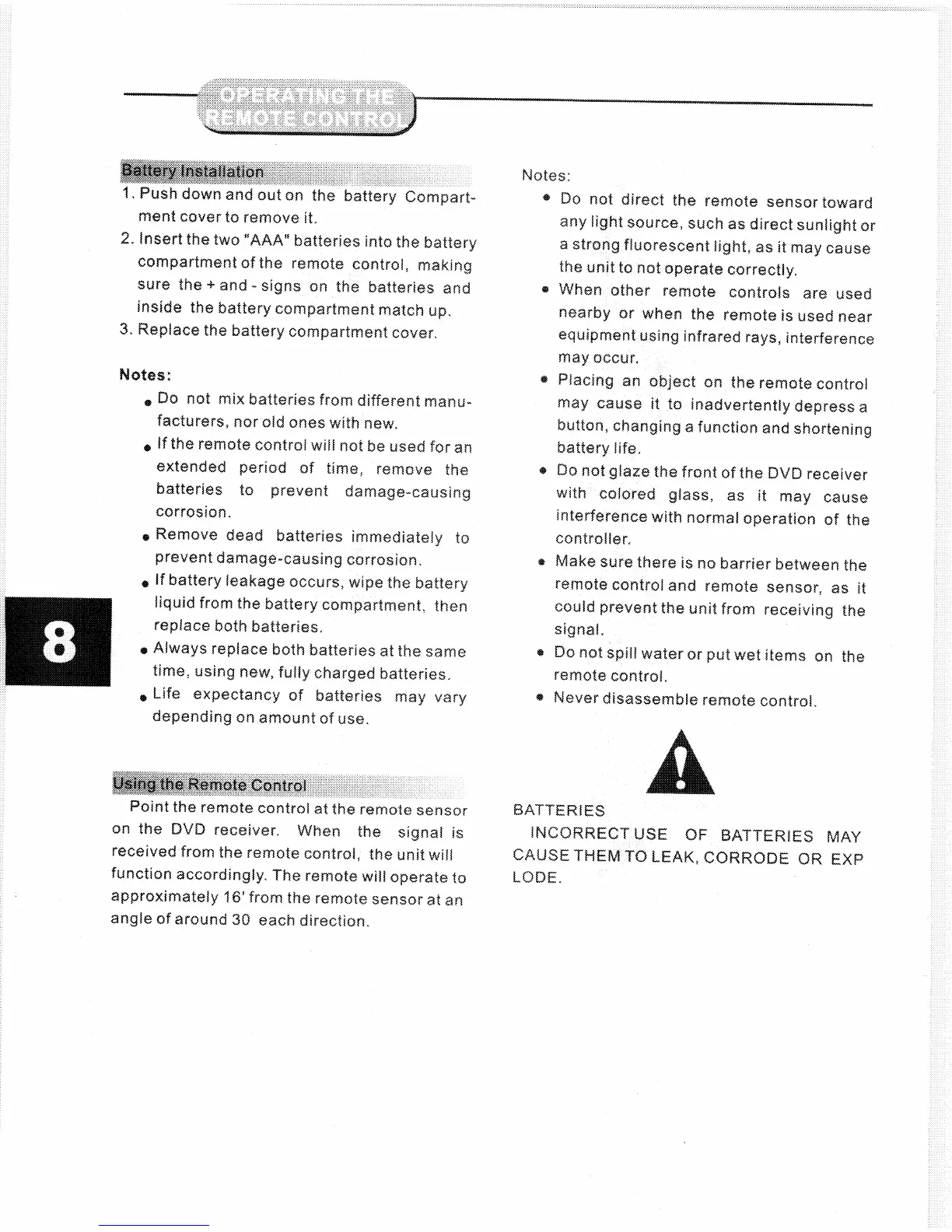 Coby DVD-925 - Operating the Remote Control; Battery Installation; Using the Remote Control