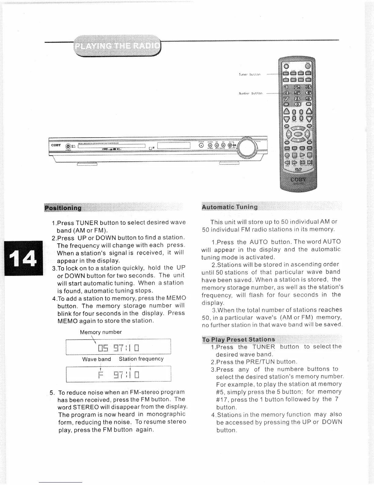 Coby DVD-925 - Playing the Radio; Positioning; Automatic Tuning; To Play Preset Stations