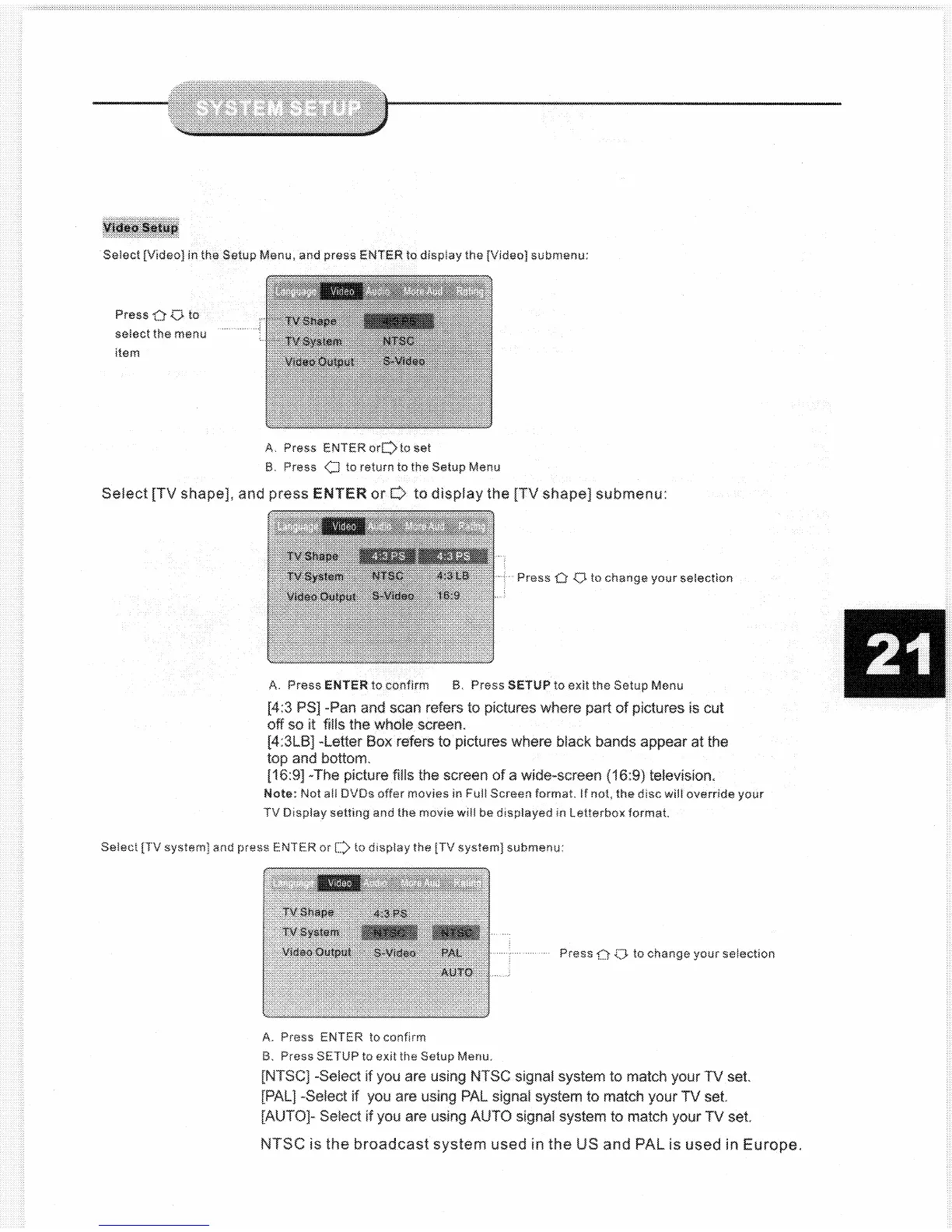 Coby DVD-925 - System Setup: Video Configuration; Video Setup: TV Shape and Output; Video Setup: TV System Selection