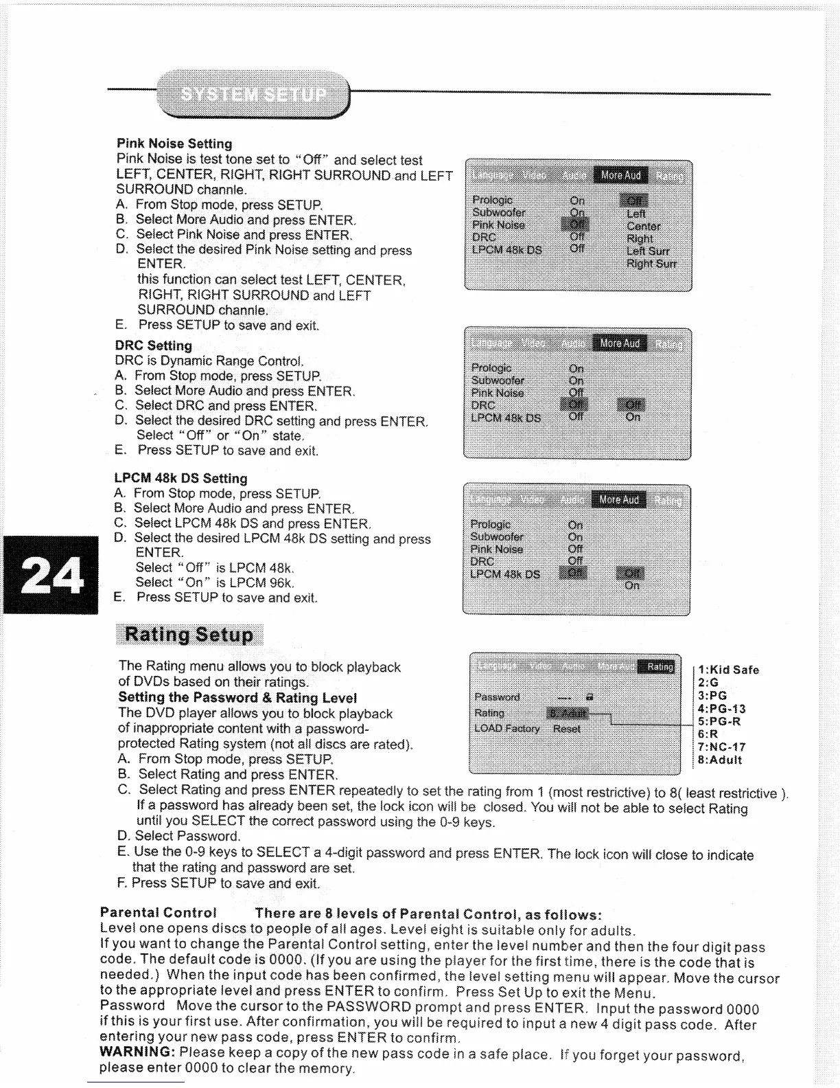 Coby DVD-925 - System Setup: Advanced Audio & Ratings; Parental Control and Password Setup