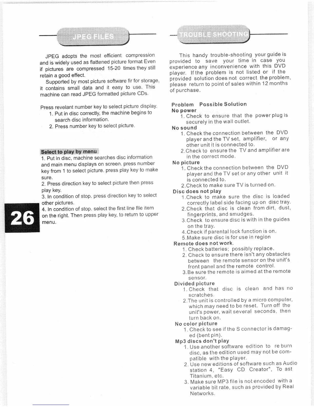 Coby DVD-925 - JPEG Files; Troubleshooting; Select to Play by Menu