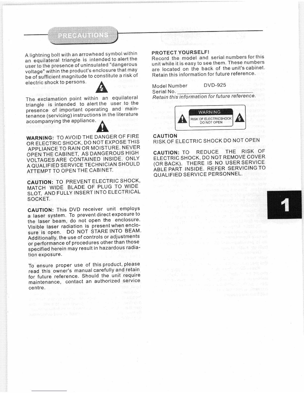 Coby DVD-925 - Precautions and Safety Warnings; Protect Yourself; Safety Warnings and Cautions