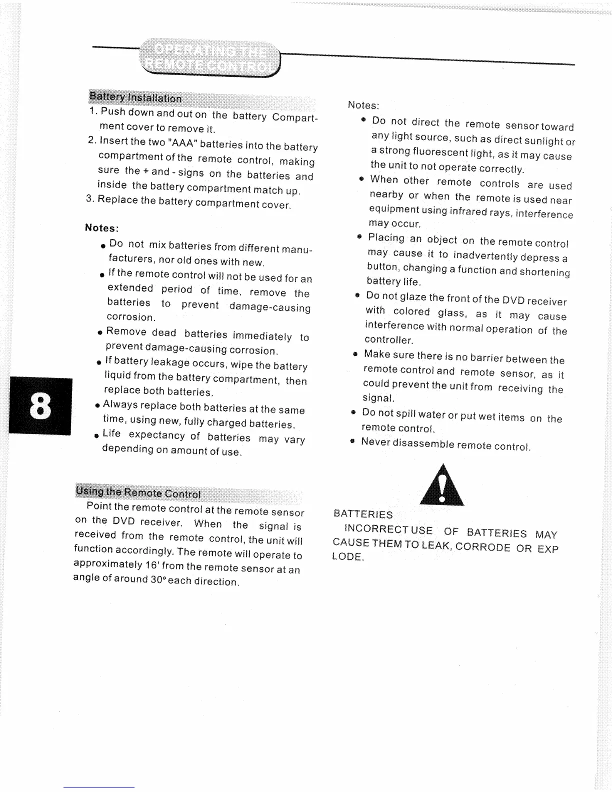 Coby DVD915 - Remote Control Operation; Battery Installation and Notes; Remote Control Usage Guidelines