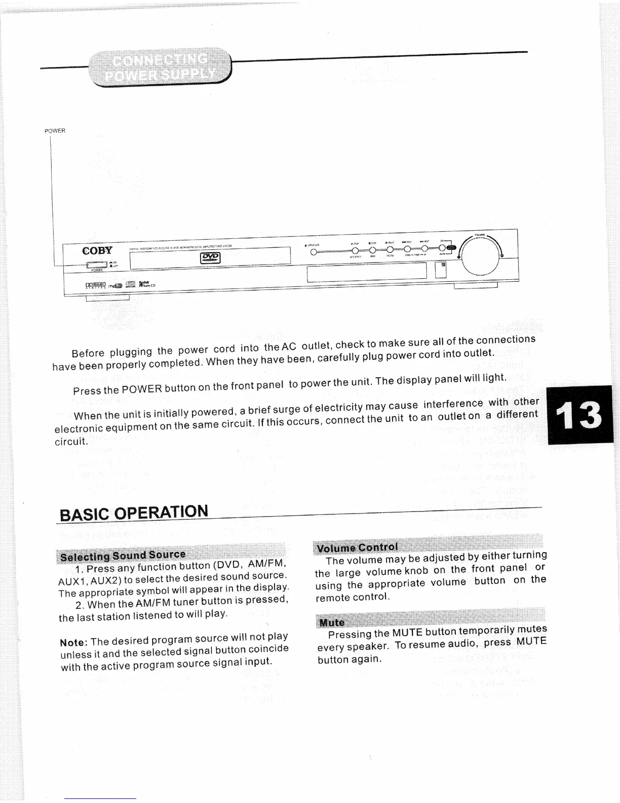 Coby DVD915 - Power and Basic Operation; Power Connection and Initial Use; Sound Source and Volume Control