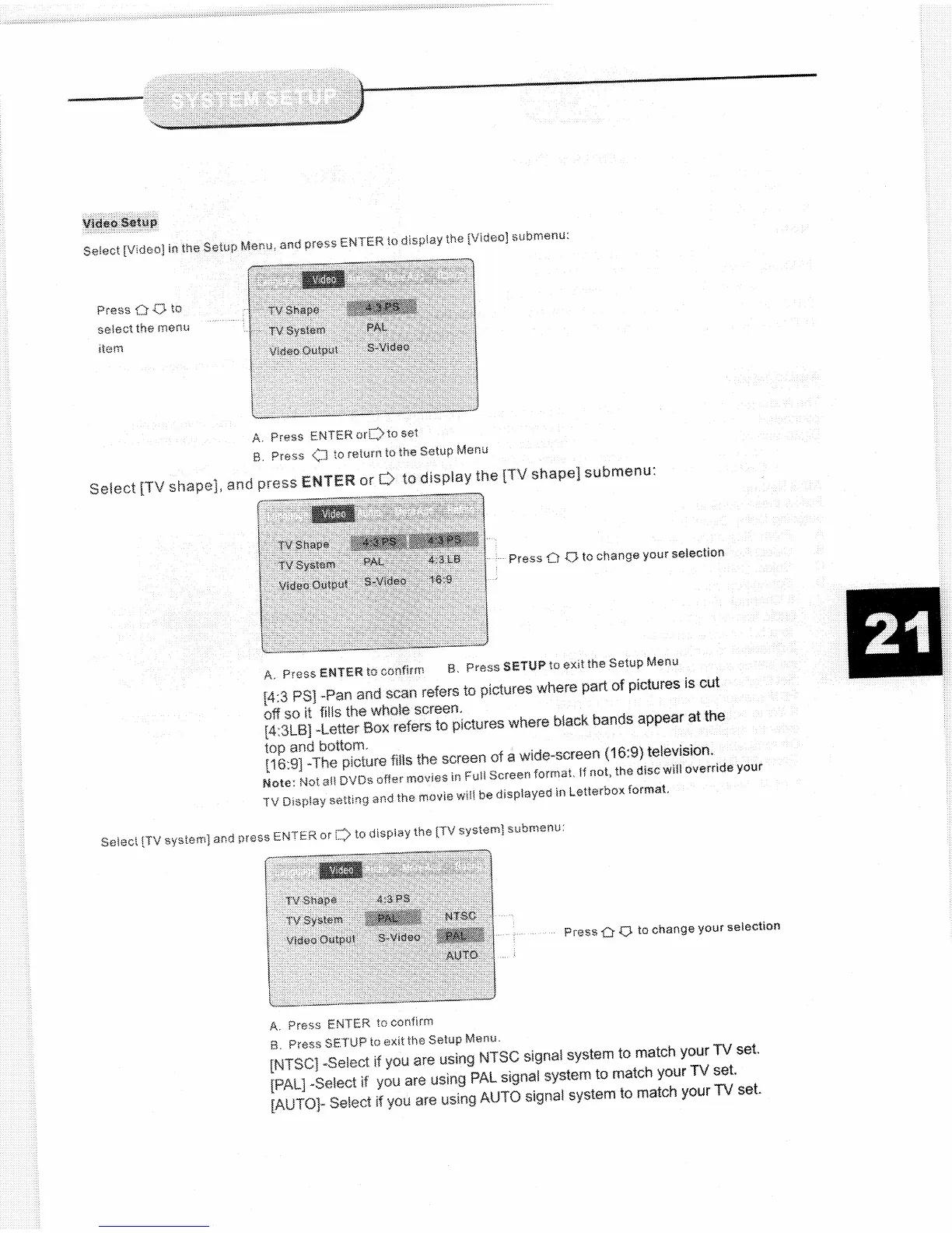 Coby DVD915 - System Setup - Video Configuration; TV Shape and Aspect Ratio Settings; TV System and Video Output Selection