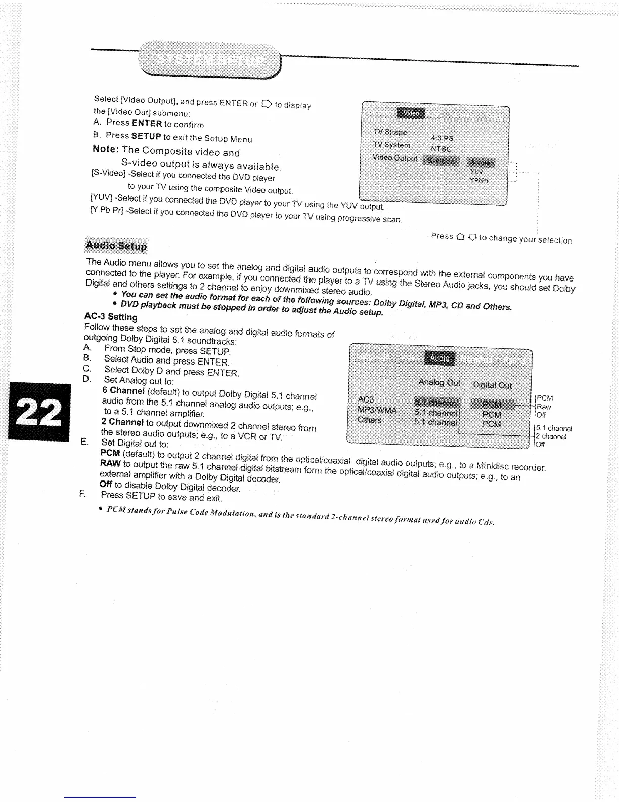 Coby DVD915 - System Setup - Audio Configuration; Analog and Digital Audio Output Settings