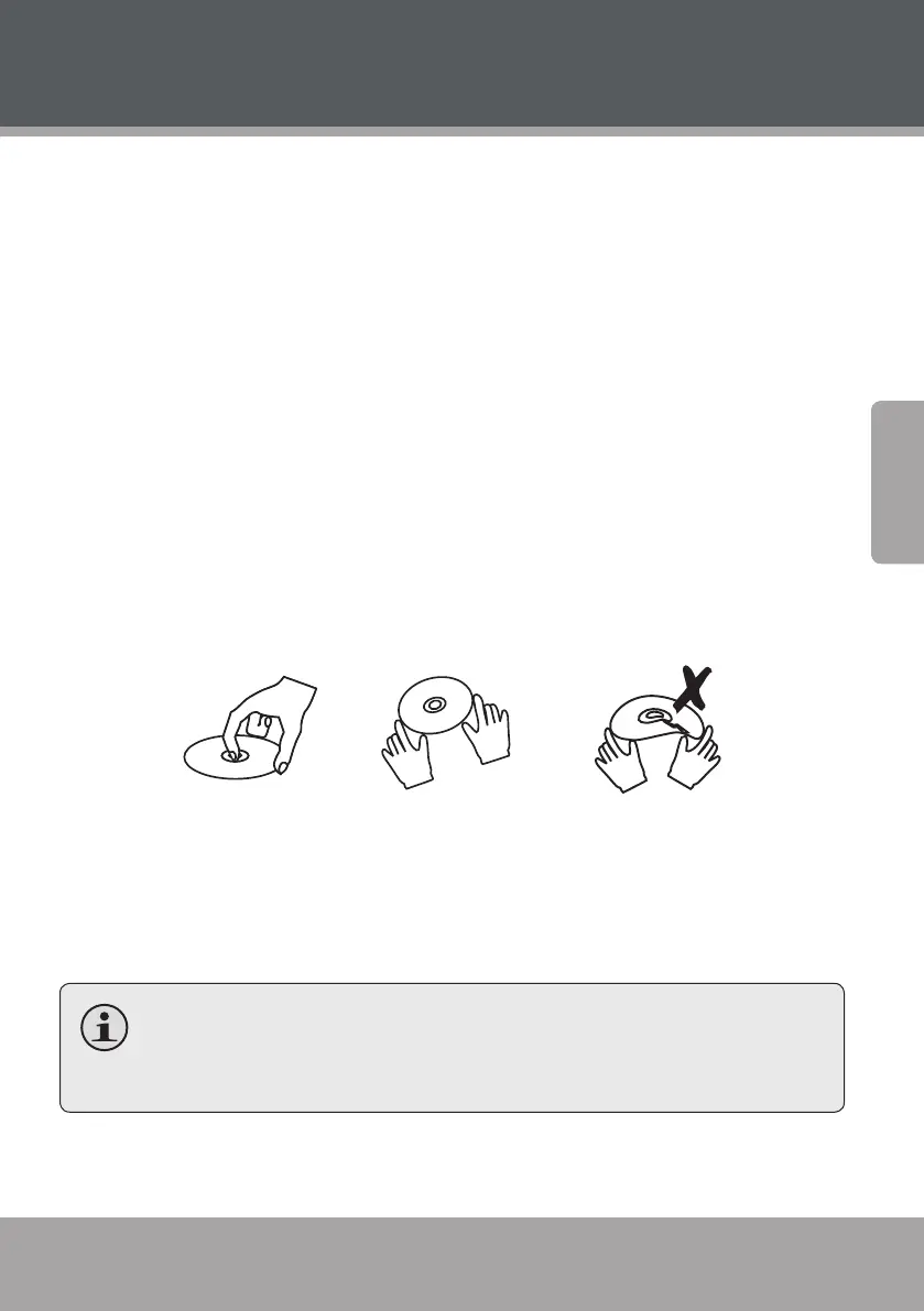 Sostenga el DVD/CD desde los bordes. Evite tocar el lado grabado