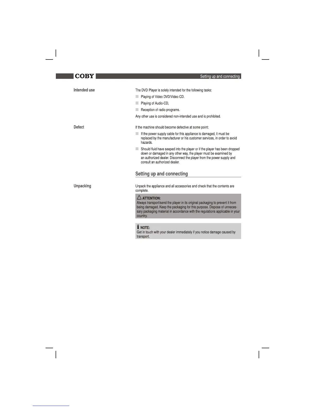 Coby DVD988 - Setup and Connections; Initial Setup and Unpacking