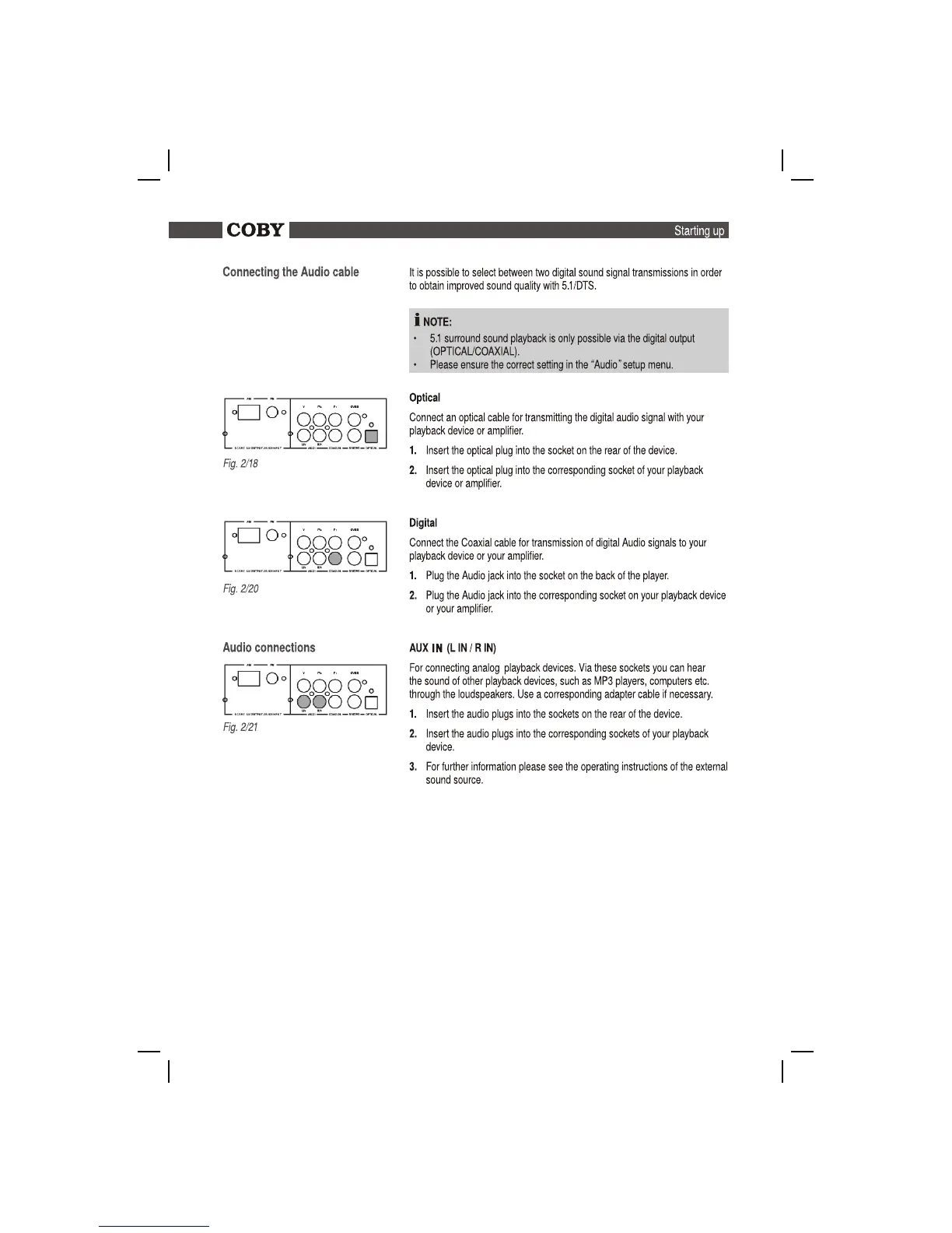 Coby DVD988 - Connecting the Audio Cable; Optical; Digital; Aux in