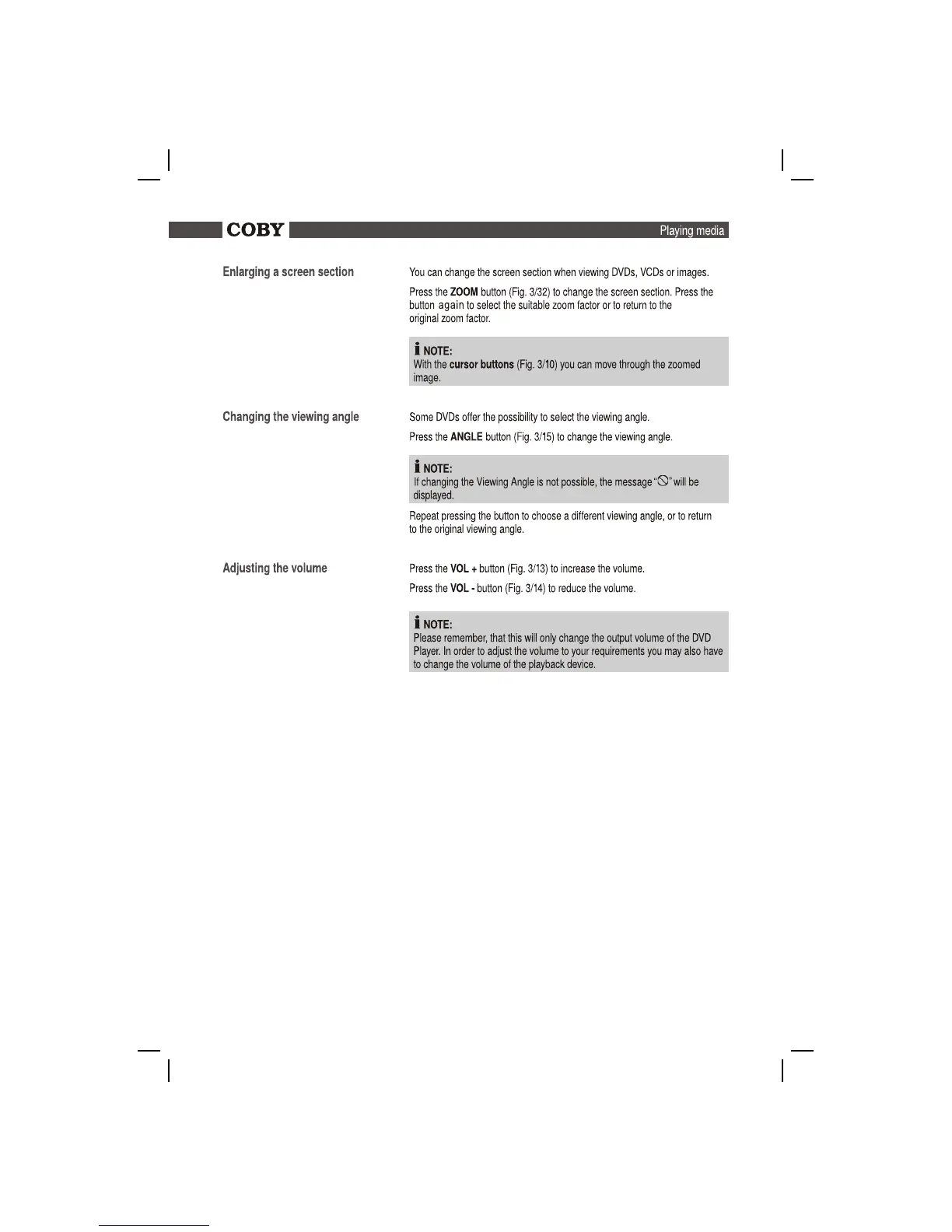 Coby DVD988 - Enlarging a Screen Section; Changing the Viewing Angle; Adjusting the Volume