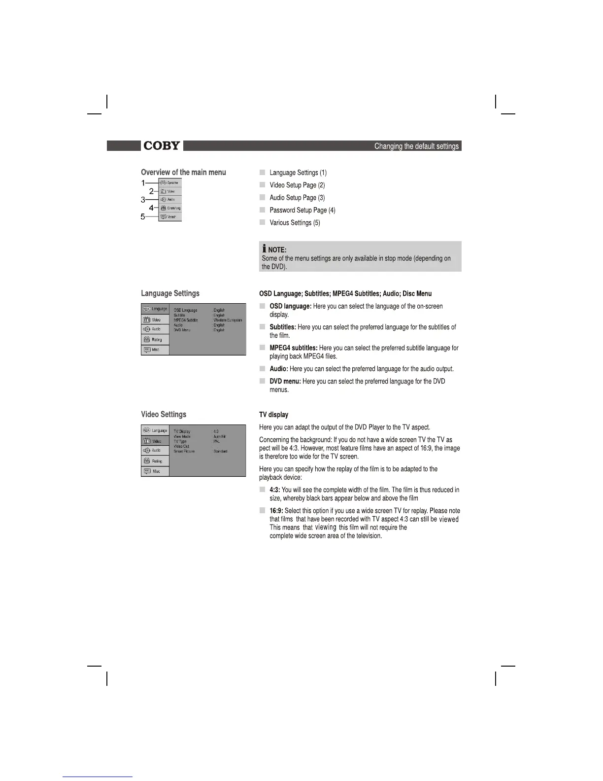 Coby DVD988 - Overview of the Main Menu; Language Settings; Video Settings; TV Display
