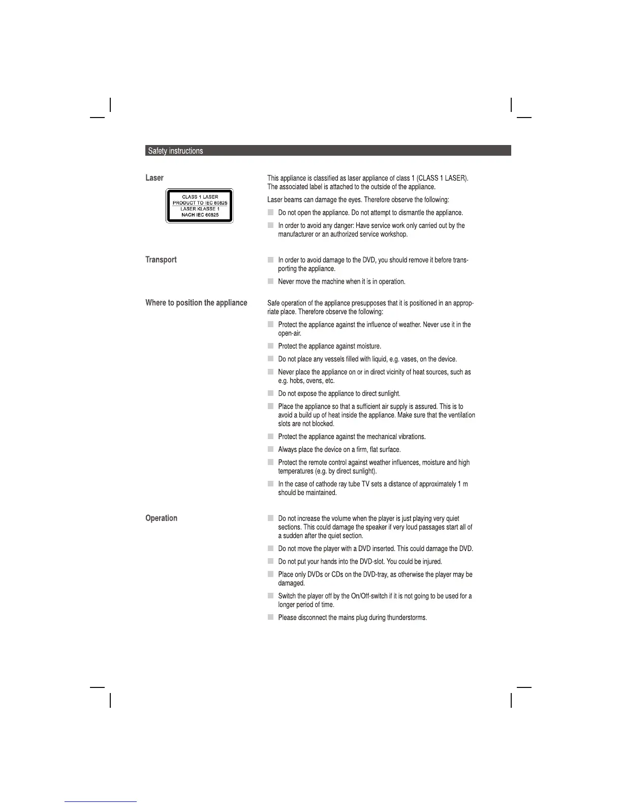 Coby DVD988 - Appliance Handling and Environment Safety