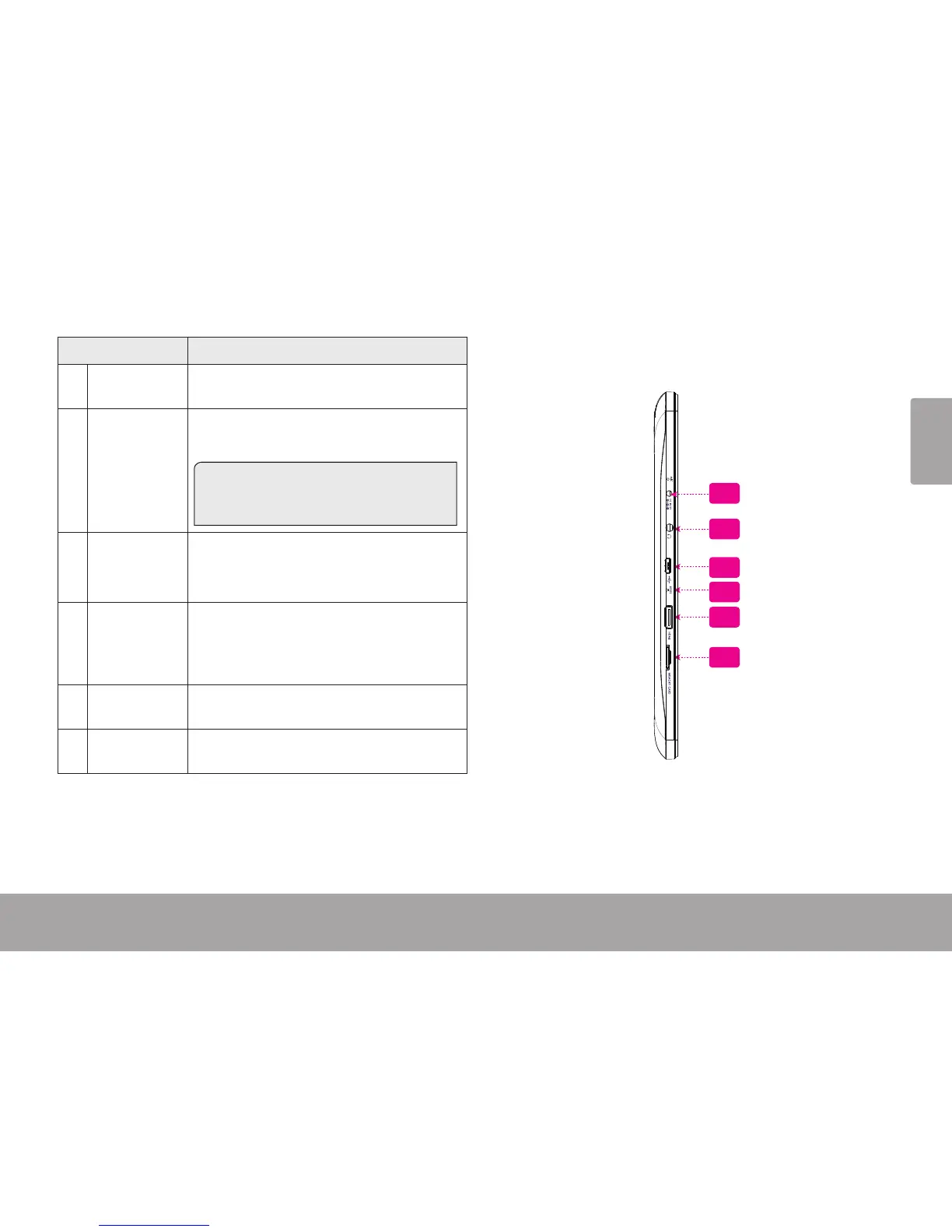 9 Reset key Press to reset the tablet if it freezes or