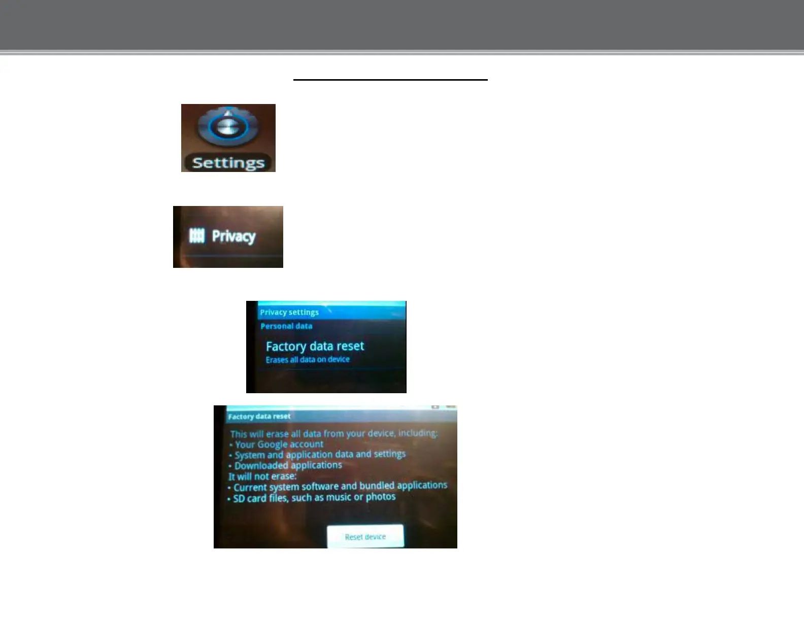 Coby Kyros - UFactory Data Reset; Step 1- Go to “Settings”; Step 2- Go to “Privacy”; Step 3- Select “Factory Data Reset”