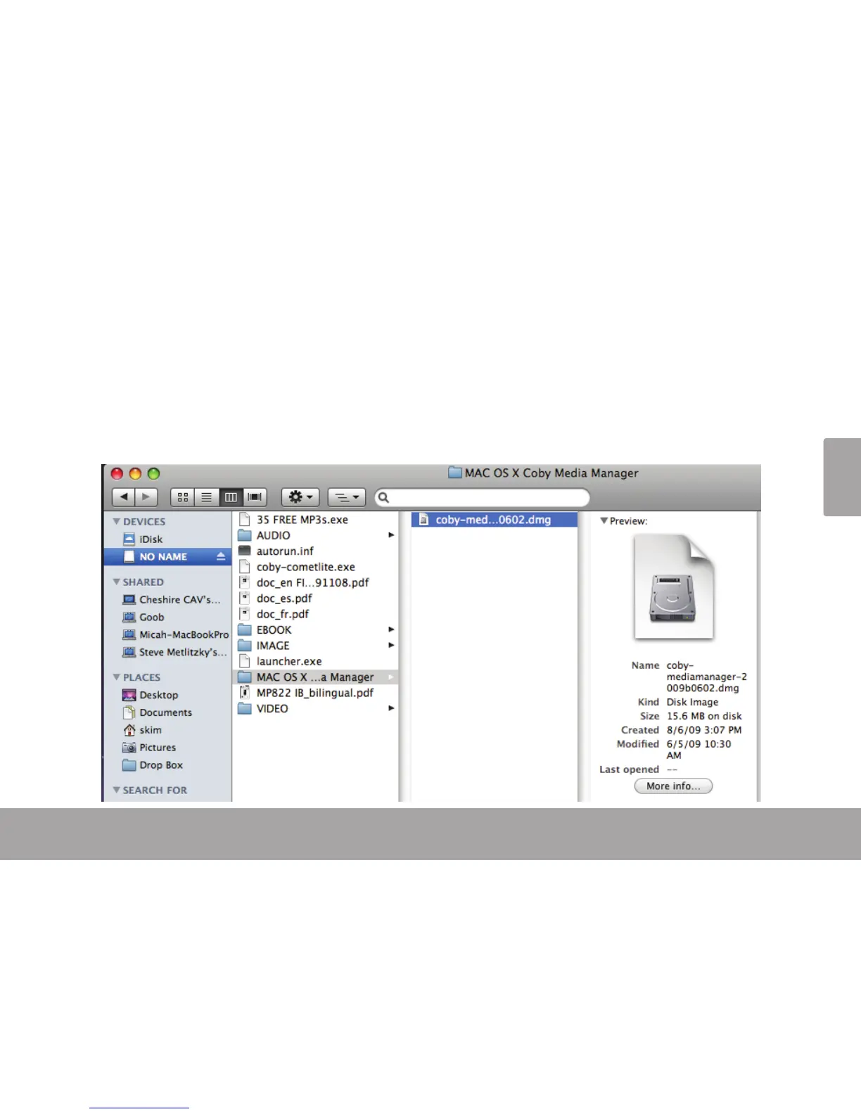 Para instalar Coby Media Manager (CMM) en una computadora que ejecuta el sistema operativo Macintosh OS X: